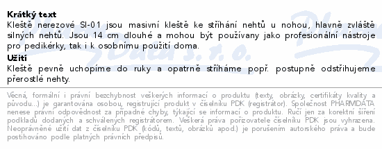 Kleště nerezové SI-01 jsou masivní kleště ke stříhání nehtů u nohou, hlavně zvláště silných nehtů. Jsou 14 cm dlouhé a mohou být používány jako profesionální nástroje pro pedikérky, tak i k osobnímu použití doma.