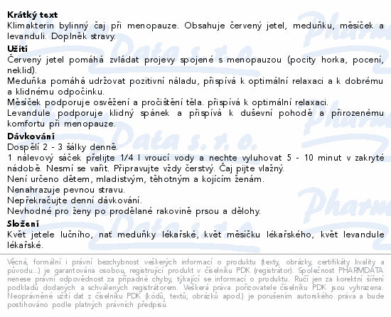 Klimakterin bylinný čaj při menopauze. Obsahuje červený jetel, meduňku, měsíček a levanduli. Doplněk stravy.