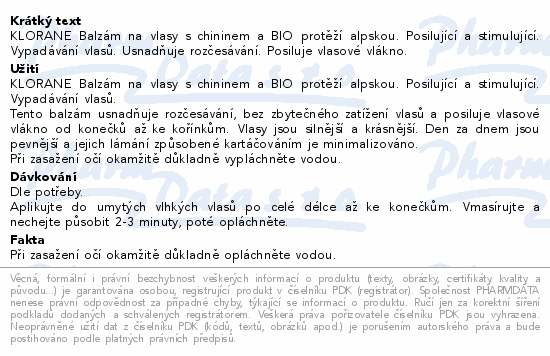 KLORANE Balzám na vlasy s chininem a BIO protěží alpskou. Posilující a stimulující. Vypadávání vlasů. Usnadňuje rozčesávání. Posiluje vlasové vlákno.