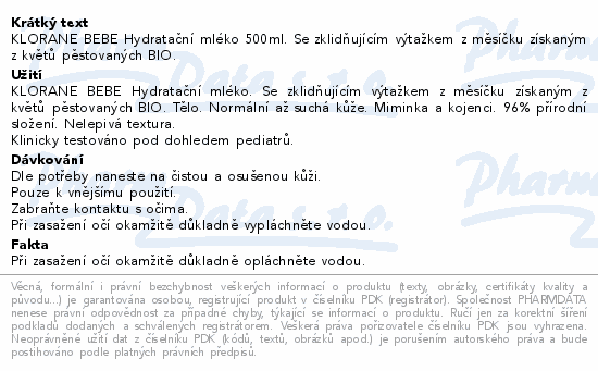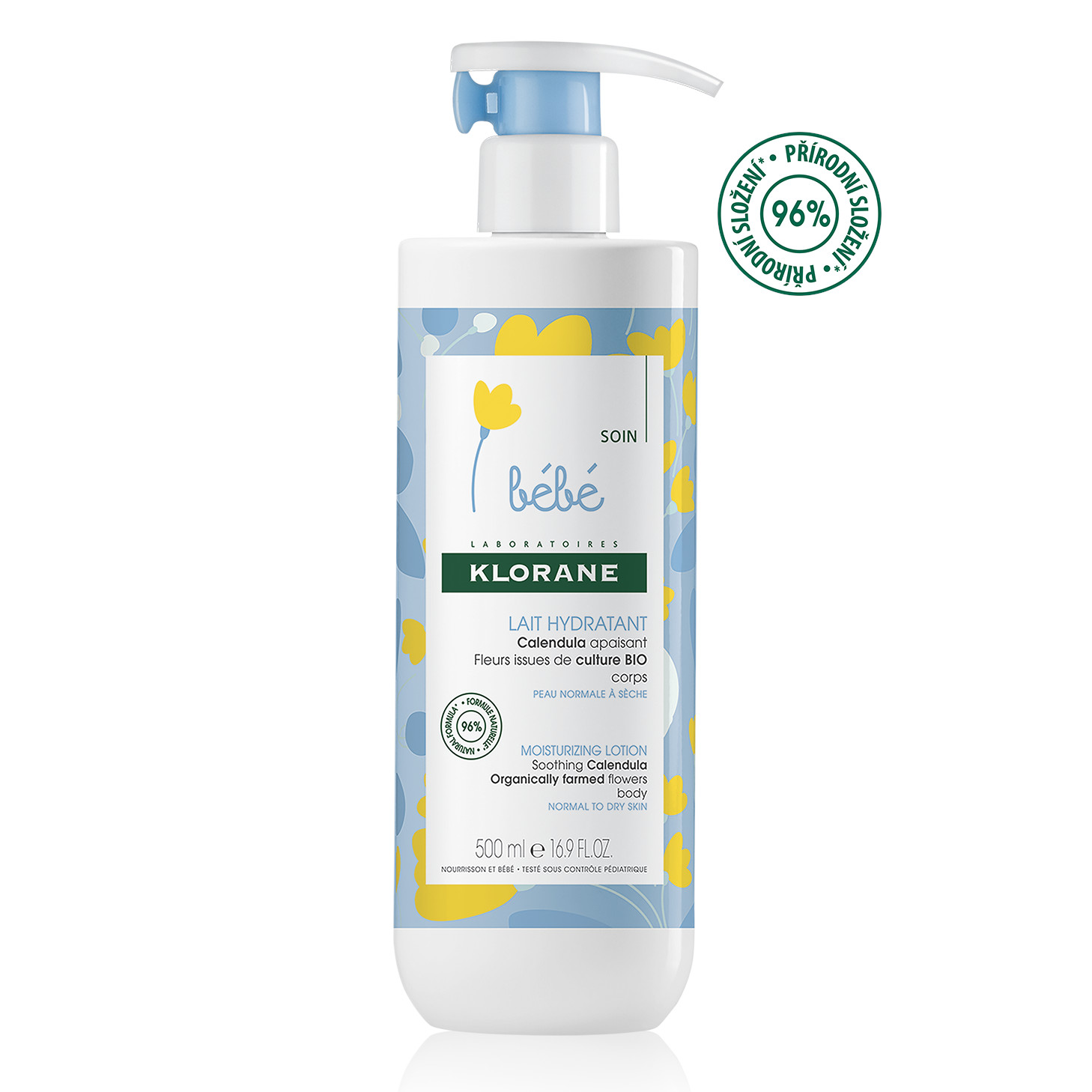 KLORANE BEBE Hydratační mléko 500ml. Se zklidňujícím výtažkem z měsíčku získaným z květů pěstovaných BIO.