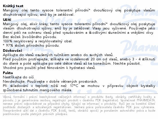 Mangový olej tento vysoce tolerantní přírodní* dvoufázový olej poskytuje vlasům dlouhotrvající výživu, aniž by je zatěžoval.