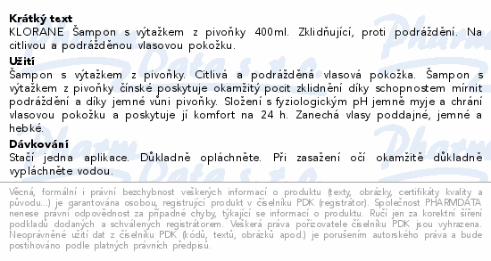 KLORANE Šampon s výtažkem z pivoňky 400ml. Zklidňující, proti podráždění. Na citlivou a podrážděnou vlasovou pokožku.