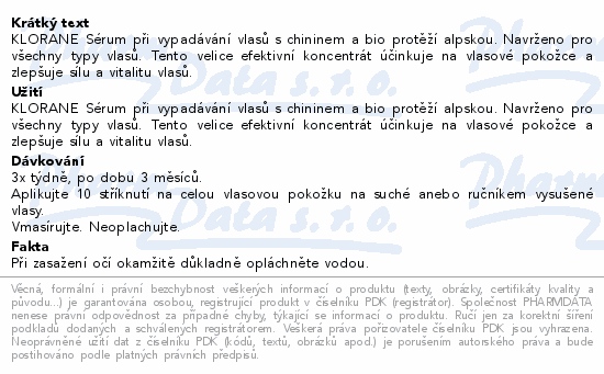 KLORANE Sérum při vypadávání vlasů s chininem a bio protěží alpskou. Navrženo pro všechny typy vlasů. Tento velice efektivní koncentrát účinkuje na vlasové pokožce a zlepšuje sílu a vitalitu vlasů.