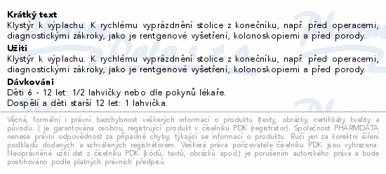 Klystýr k výplachu. K rychlému vyprázdnění stolice z konečníku, např. před operacemi, diagnostickými zákroky, jako je rentgenové vyšetření, kolonoskopiemi a před porody.