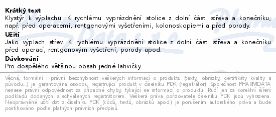 Klystýr k výplachu. K rychlému vyprázdnění stolice z dolní části střeva a konečníku, např. před operacemi, rentgenovými vyšetřeními, kolonoskopiemi a před porody.