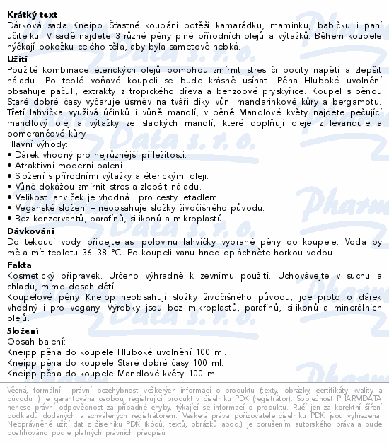 Dárková sada Kneipp Šťastné koupání potěší kamarádku, maminku, babičku i paní učitelku. V sadě najdete 3 různé pěny plné přírodních olejů a výtažků. Během koupele hýčkají pokožku celého těla, aby byla sametově hebká.