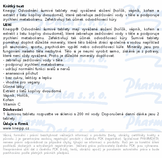Kneipp Odvodnění šumivé tablety mají vyvážené složení (hořčík, vápník, kofein a extrakt z listu kopřivy dvoudomé), které zabraňuje zadržování vody v těle a podporuje zrychlení metabolismu. Zefektivňují tak účinek odvodňovací kúry.