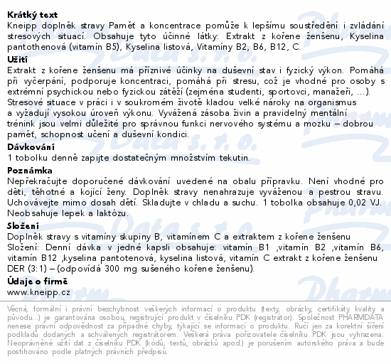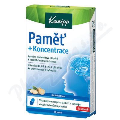 Kneipp doplněk stravy Paměť a koncentrace pomůže k lepšímu soustředění i zvládání stresových situací. Obsahuje tyto účinné látky: Extrakt z kořene ženšenu, Kyselina pantothenová (vitamín B5), Kyselina listová, Vitamíny B2, B6, B12, C.