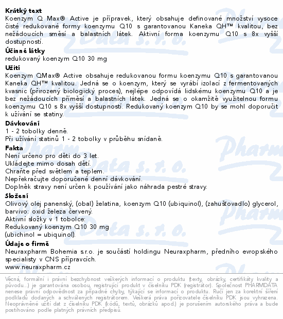 Koenzym Q Max® Active je přípravek, který obsahuje definované množství vysoce čisté redukované formy koenzymu Q10 s garantovanou Kaneka QH™ kvalitou, bez nežádoucích směsí a balastních látek. Aktivní forma koenzymu Q10 s 8x vyšší dostupností.