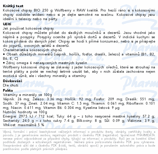 Kokosové chipsy BIO 250 g Wolfberry v RAW kvalitě. Pro hezčí ráno si s kokosovými chipsy ozdobte snídani nebo si je dejte samotné na svačinu. Kokosové chipsy jsou ideální k televizy nebo na párty.