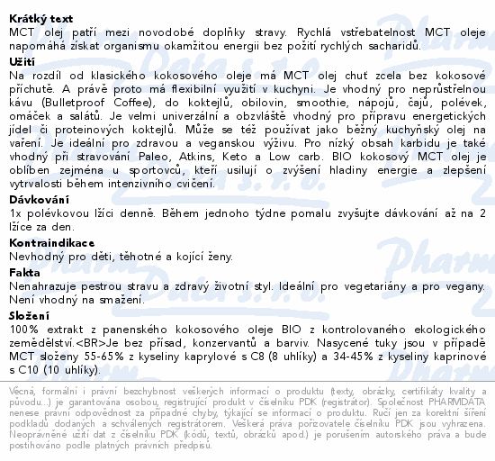MCT olej patří mezi novodobé doplňky stravy. Rychlá vstřebatelnost MCT oleje napomáhá získat organismu okamžitou energii bez požití rychlých sacharidů.