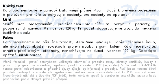 Kolo pod nemocné je gumový kruh, vnější průměr 45cm. Slouží k prevenci prosezenin či proleženin pro hůře se pohybující pacienty, pro pacienty po operacích.