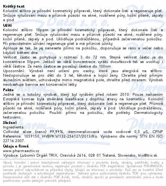 Koloidní stříbro je přírodní kosmetický přípravek, který dokonale čistí a regeneruje pleť. Snižuje vylučování mazu a příznivě působí na akné, rozšířené póry, kožní plísně, zápaly a pod.