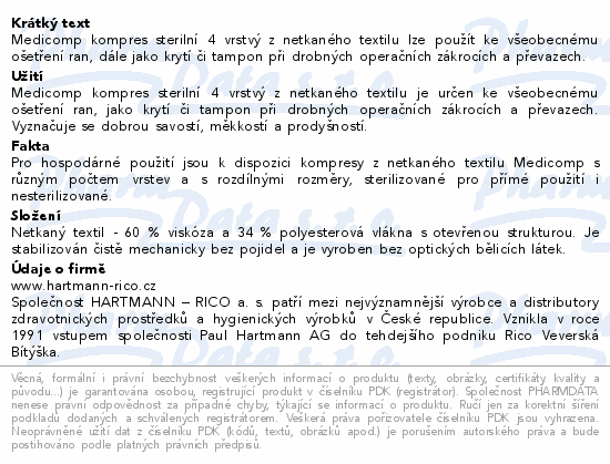 Medicomp kompres sterilní 4 vrstvý z netkaného textilu lze použít ke všeobecnému ošetření ran, dále jako krytí či tampon při drobných operačních zákrocích a převazech.