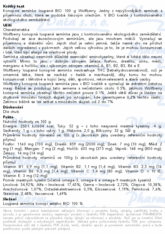 Konopné semínko loupané BIO 100 g Wolfberry. Jedny z nejvýživnějších semínek s příjemnou chutí, která se podobá lískovým ořechům. V BIO kvalitě z kontrolovaného ekologického zemědělství.