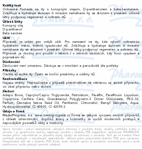 Ochranná Pomáda na rty s konopným olejem, D-panthenolem a beta-karotenem. Zvláčňuje a hydratuje sluncem či mrazem namáhané rty se sklonem k praskání. Účinné látky podporují regeneraci a ochranu rtů.