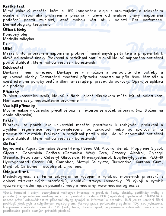 Mírně chladivý masážní krém s 10% konopného oleje s prokrvujícím a relaxačním účinkem. Napomáhá prokrvení a přispívá k úlevě od svalové únavy, napomáhá potlačení pocitů ztuhlosti, které mohou vést až k bolesti. Bez parfemace. Dermatologicky testováno.