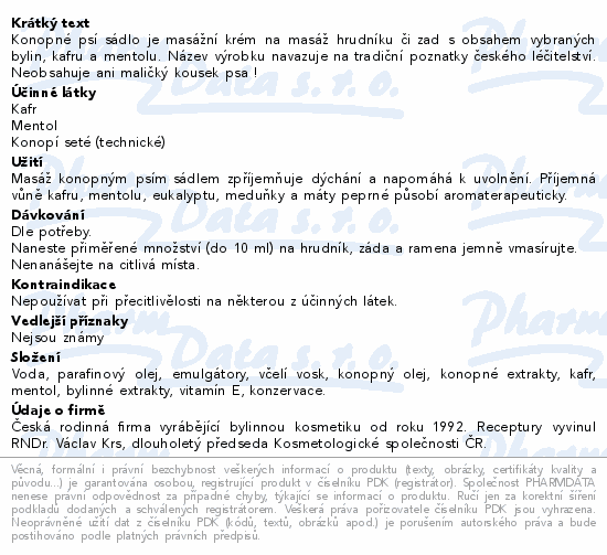 Konopné psí sádlo je masážní krém na masáž hrudníku či zad s obsahem vybraných bylin, kafru a mentolu. Název výrobku navazuje na tradiční poznatky českého léčitelství. Neobsahuje ani maličký kousek psa !