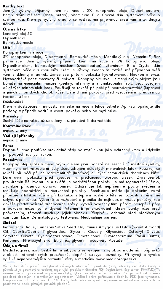 Jemný, výživný, příjemný krém na ruce s 5% konopného oleje, D-panthenolem, bambuckým málsem (shea butter), vitaminem E a Crystal skin systémem péče o suchou kůži. Krém je výživný, snadno se roztírá, má příjemnou svěží vůni a zklidňující účinek.