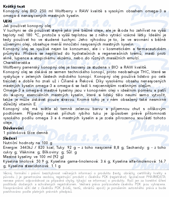 Konopný olej BIO 250 ml Wolfberry v RAW kvalitě s vysokým obsahem omega-3 a omega-6 nenasycených mastných kyselin.