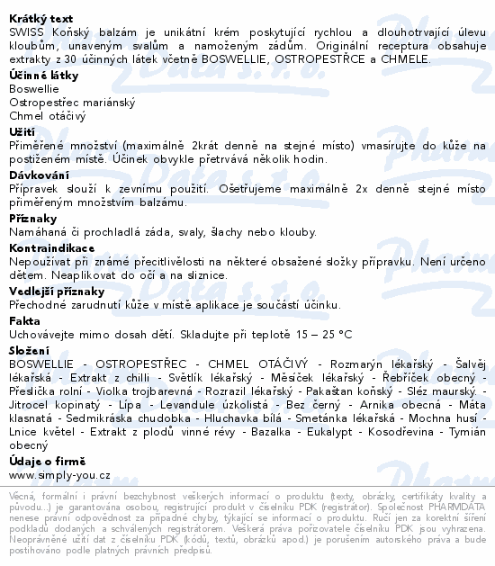 SWISS Koňský balzám je unikátní krém poskytující rychlou a dlouhotrvající úlevu kloubům, unaveným svalům a namoženým zádům. Originální receptura obsahuje extrakty z 30 účinných látek včetně BOSWELLIE, OSTROPESTŘCE a CHMELE.