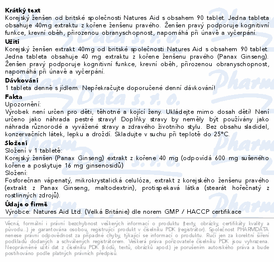 Korejský ženšen od britské společnosti Natures Aid s obsahem 90 tablet. Jedna tableta obsahuje 40mg extraktu z kořene ženšenu pravého. Ženšen pravý podporuje kognitivní funkce, krevní oběh, přirozenou obranyschopnost, napomáhá při únavě a vyčerpání.