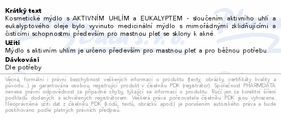 Kosmetické mýdlo s AKTIVNÍM UHLÍM a EUKALYPTEM - sloučením aktivního uhlí a eukalyptového oleje bylo vyvinuto medicinální mýdlo s mimořádnými zklidňujícími a čisticími schopnostmi především pro mastnou pleť se sklony k akné.