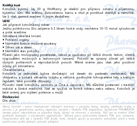 Kotvičník bylinný čaj 50 g Wolfberry je ideální pro přípravu odvaru s příjemnou, bylinnou vůni. Má světlou, žlutozelenou barvu a chuť je poněkud drsnější a nahořklá, lze ji však zjemnit medem či jiným sladidlem.