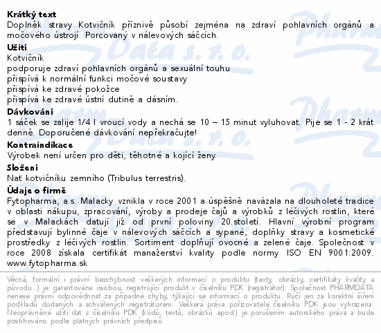 Doplněk stravy Kotvičník příznivě působí zejména na zdraví pohlavních orgánů a močového ústrojí. Porcovaný v nálevových sáčcích.