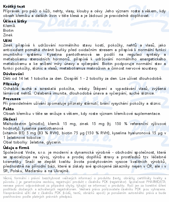 Přípravek pro péči o kůži, nehty, vlasy, klouby a cévy. Jeho význam roste s věkem, kdy obsah křemíku a dalších živin v těle klesá a je žádoucí je pravidelně doplňovat.