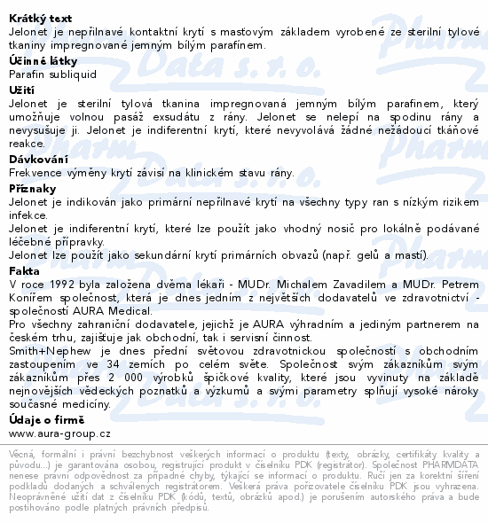 Jelonet je nepřilnavé kontaktní krytí s masťovým základem vyrobené ze sterilní tylové tkaniny impregnované jemným bílým parafínem.