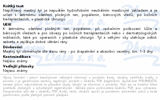 Nepřilnavý mastný tyl je napuštěn hydrofobním neutrálním masťovým základem a je určen k šetrnému ošetření plošných ran, popálenin, bércových vředů, po kožních transplantacích, v plastické chirurgii.