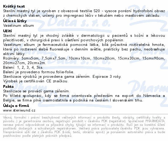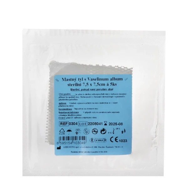 Sterilní mastný tyl je vyroben z obvazové textilie S20 - vysoce porézní hydrofobní obvaz z chemických vláken, určený pro impregnaci léčiv v tekutém nebo masťovém základu.