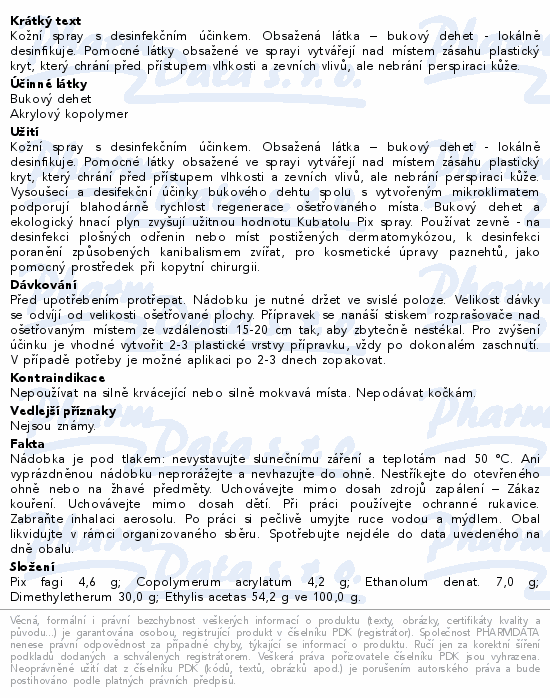 Kožní spray s desinfekčním účinkem. Obsažená látka – bukový dehet - lokálně desinfikuje. Pomocné látky obsažené ve sprayi vytvářejí nad místem zásahu plastický kryt, který chrání před přístupem vlhkosti a zevních vlivů, ale nebrání perspiraci kůže.