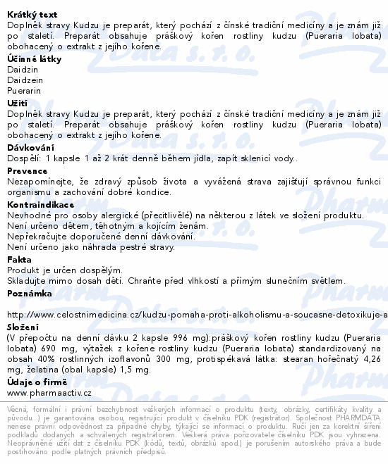 Doplněk stravy Kudzu je preparát, který pochází z čínské tradiční medicíny a je znám již po staletí. Preparát obsahuje práškový kořen rostliny kudzu (Pueraria lobata) obohacený o extrakt z jejího kořene.