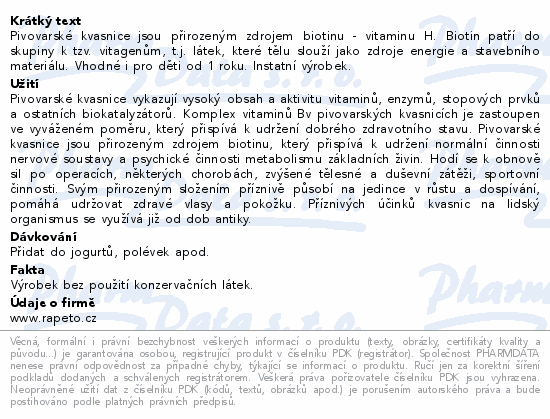 Pivovarské kvasnice jsou přirozeným zdrojem biotinu - vitaminu H. Biotin patří do skupiny k tzv. vitagenům, t.j. látek, které tělu slouží jako zdroje energie a stavebního materiálu. Vhodné i pro děti od 1 roku. Instatní výrobek.