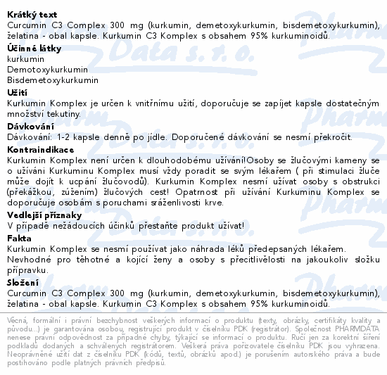 Curcumin C3 Complex 300 mg (kurkumin, demetoxykurkumin, bisdemetoxykurkumin), želatina - obal kapsle. Kurkumin C3 Komplex s obsahem 95% kurkuminoidů.