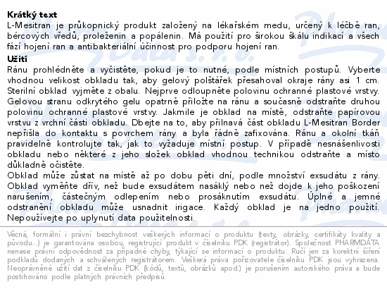 L-Mesitran je průkopnický produkt založený na lékařském medu, určený k léčbě ran, bércových vředů, proleženin a popálenin. Má použití pro širokou škálu indikací a všech fází hojení ran a antibakteriální účinnost pro podporu hojení ran.