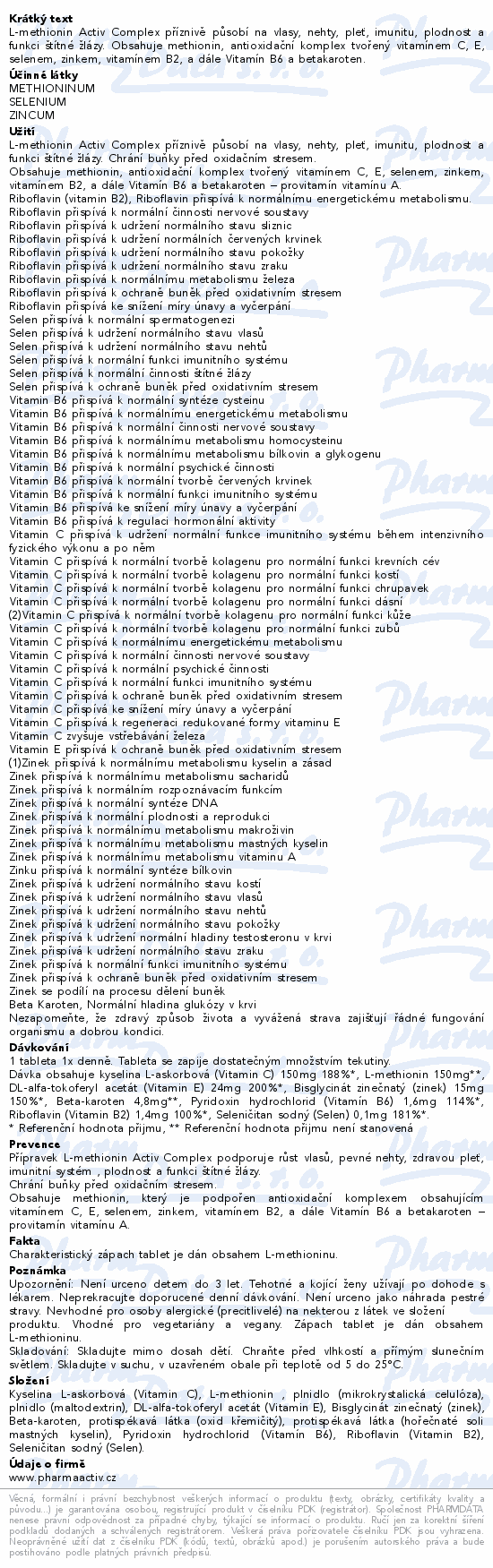 L-methionin Activ Complex příznivě působí na vlasy, nehty, pleť, imunitu, plodnost a funkci štítné žlázy. Obsahuje methionin, antioxidační komplex tvořený vitamínem C, E, selenem, zinkem, vitamínem B2, a dále Vitamín B6 a betakaroten.