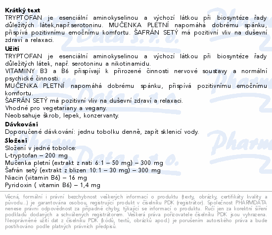 TRYPTOFAN je esenciální aminokyselinou a výchozí látkou při biosyntéze řady důležitých látek,např.serotoninu. MUČENKA PLETNÍ napomáhá dobrému spánku, přispívá pozitivnímu emočnímu komfortu. ŠAFRÁN SETÝ má pozitivní vliv na duševní zdraví a relaxaci.