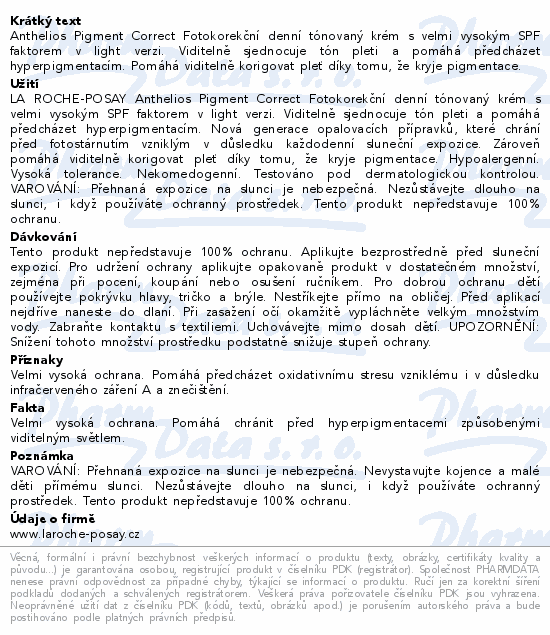 Anthelios Pigment Correct Fotokorekční denní tónovaný krém s velmi vysokým SPF faktorem v light verzi. Viditelně sjednocuje tón pleti a pomáhá předcházet hyperpigmentacím. Pomáhá viditelně korigovat pleť díky tomu, že kryje pigmentace.