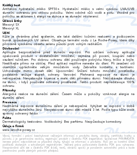 Anthelios hydratační mléko SPF50+. Hydratační mléko s velmi vysokou UVA/UVB sluneční ochranou pro citlivou pokožku. Velmi odolné vůči vodě a potu. Vhodné pro pokožku se sklonem k alergii na slunce a se sluneční intolerancí.