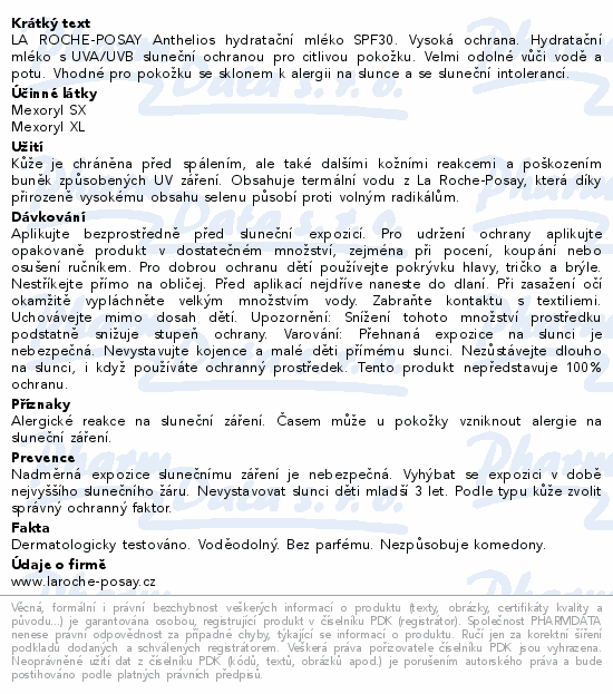LA ROCHE-POSAY Anthelios hydratační mléko SPF30. Vysoká ochrana. Hydratační mléko s UVA/UVB sluneční ochranou pro citlivou pokožku. Velmi odolné vůči vodě a potu. Vhodné pro pokožku se sklonem k alergii na slunce a se sluneční intolerancí.