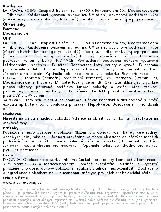 LA ROCHE-POSAY Cicaplast Balzám B5+ SPF50 s Panthenolem 5%, Madecassosidem + Tribiomou. Každodenní vystavení slunečnímu UV záření, povrchové podráždení kůže (včetně lehkých dermatologických zákroků) představují riziko vzniku hyperpigmentace.