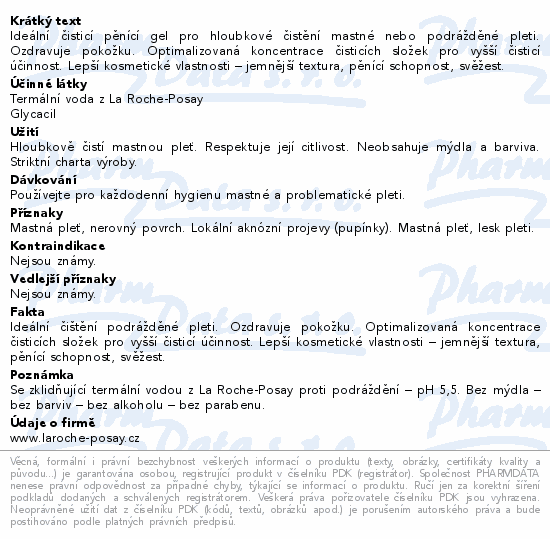 LA ROCHE-POSAY Effaclar je gel pro každodenní hloubkové čištění mastné či podrážděné pleti. Odstraňuje nečistoty a přebytek kožního mazu a zanechává pleť svěží a čistou. Effaclar gel obnovuje ochrannou bariéru, má antioxidační schopnosti, působí proti podráždění. Hodnota pH 5,5. Gel respektuje citlivost jakékoliv pleti. Má jemnou strukturu, pěnící schopnost a je svěží. Čistí ohniska bakterií, zklidňuje a odbourává toxiny. Je vhodný na mastnou a citlivou pleť. Gel neobsahuje mýdlo, je bez barviv, parfému, alkoholu a parabenů.