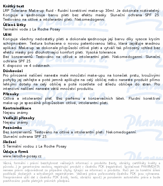 LRP Toleriane Make-up fluid - fluidní korektivní make-up 30ml. Je dokonale roztíratelný. Koriguje a sjednocuje barvu pleti bez efektu masky. Sluneční ochrana SPF 25. Testováno na citlivé a intolerantní pleti. Nekomedogenní.