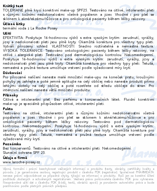 TOLERIANE plně krycí korektivní make-up SPF25. Testováno na citlivé, intolerantní pleti s různými kožními nedokonalostmi včetně popálenin a jizev. Vhodné i pro pleť se sklonem k akné/ekzému/růžovce a pro onkologické pacienty během léčby rakoviny.