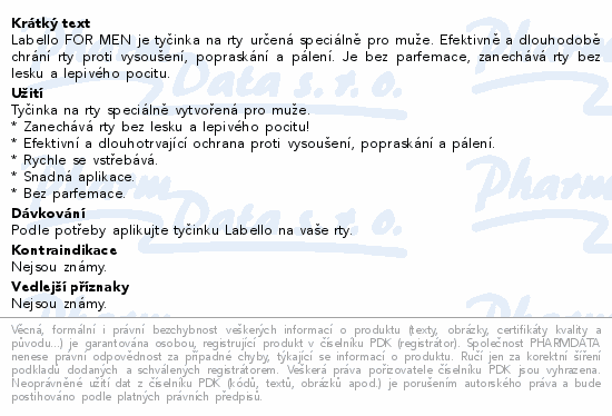 Labello FOR MEN je tyčinka na rty určená speciálně pro muže. Efektivně a dlouhodobě chrání rty proti vysoušení, popraskání a pálení. Je bez parfemace, zanechává rty bez lesku a lepivého pocitu.