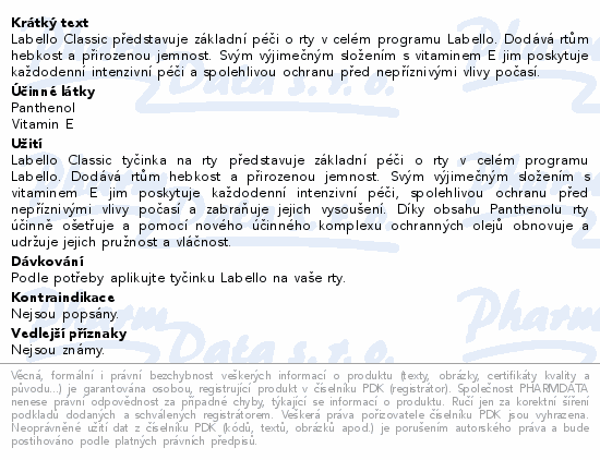 Labello Classic představuje základní péči o rty v celém programu Labello. Dodává rtům hebkost a přirozenou jemnost. Svým výjimečným složením s vitaminem E jim poskytuje každodenní intenzivní péči a spolehlivou ochranu před nepříznivými vlivy počasí.