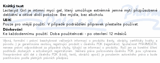 Lactacyd Girl je intimní mycí gel, který umožňuje extrémně jemné mytí přizpůsobené delikátní a citlivé dívčí pokožce. Bez mýdla, bez alkoholu.